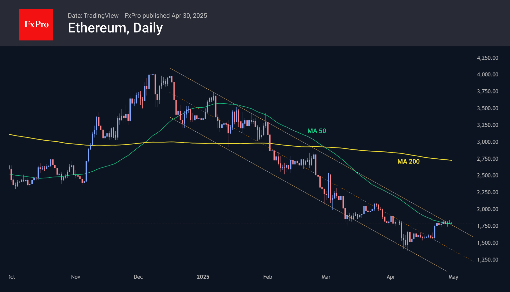 Свою мучительную борьбу с нисходящей тенденцией продолжает Ethereum, который последние семь дней топчется вокруг уровня $1 800, где также сосредоточены 50-дневная скользящая средняя и линия сопротивления нисходящего канала. Импульс роста станет важным позитивным сигналом, но, теоретически, при таких условиях базовым сценарием является разворот вниз.