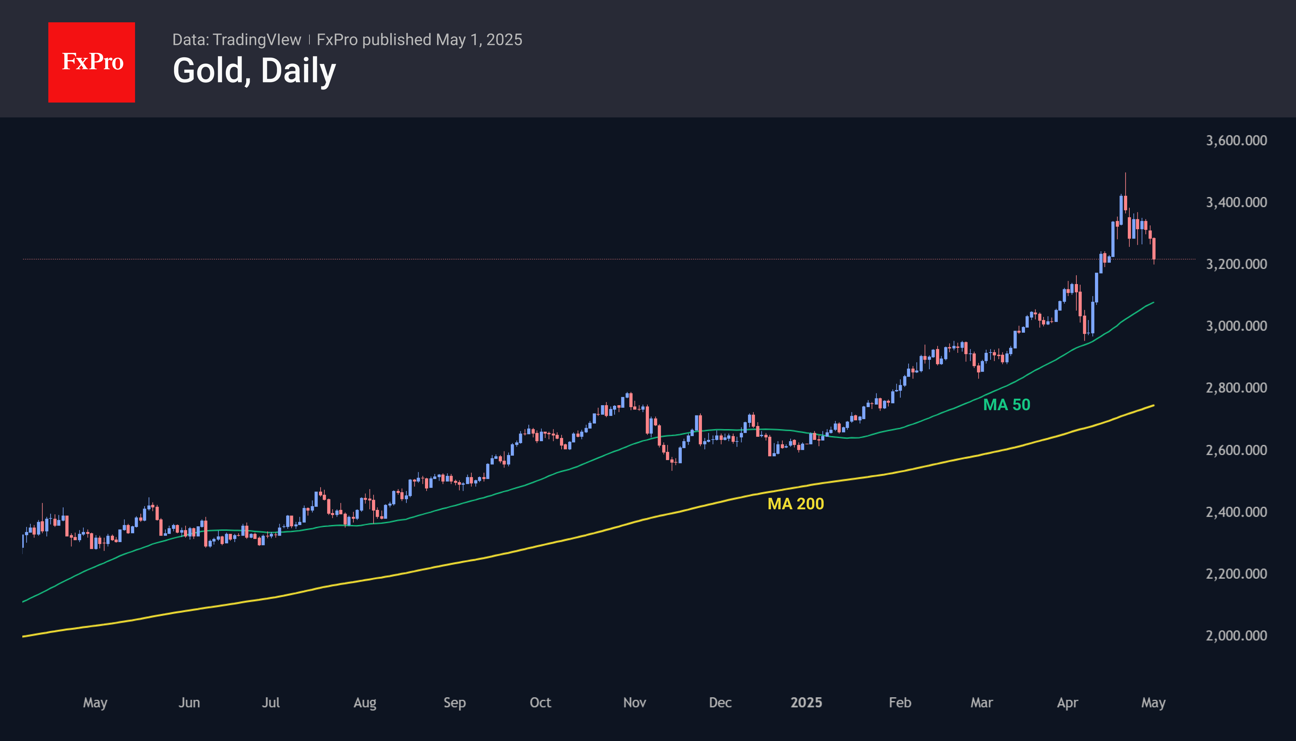 Начало апреля было за быками, а последняя пара недель управляется медведями, которые проверяют на прочность отметку $3200. Такой откат вернул цену в область консолидации середины апреля. Если рынок и далее будет двигаться вниз по тем же ступенькам, по которым забирался, следующей остановкой станет область $2900. Но в этом случае цена уже окажется ниже 50-дневной скользящей средней, подавая сигнал слома восходящей тенденции. Ускорение распродажи может быстро увести цену на консолидацию в район $2600-$2700.