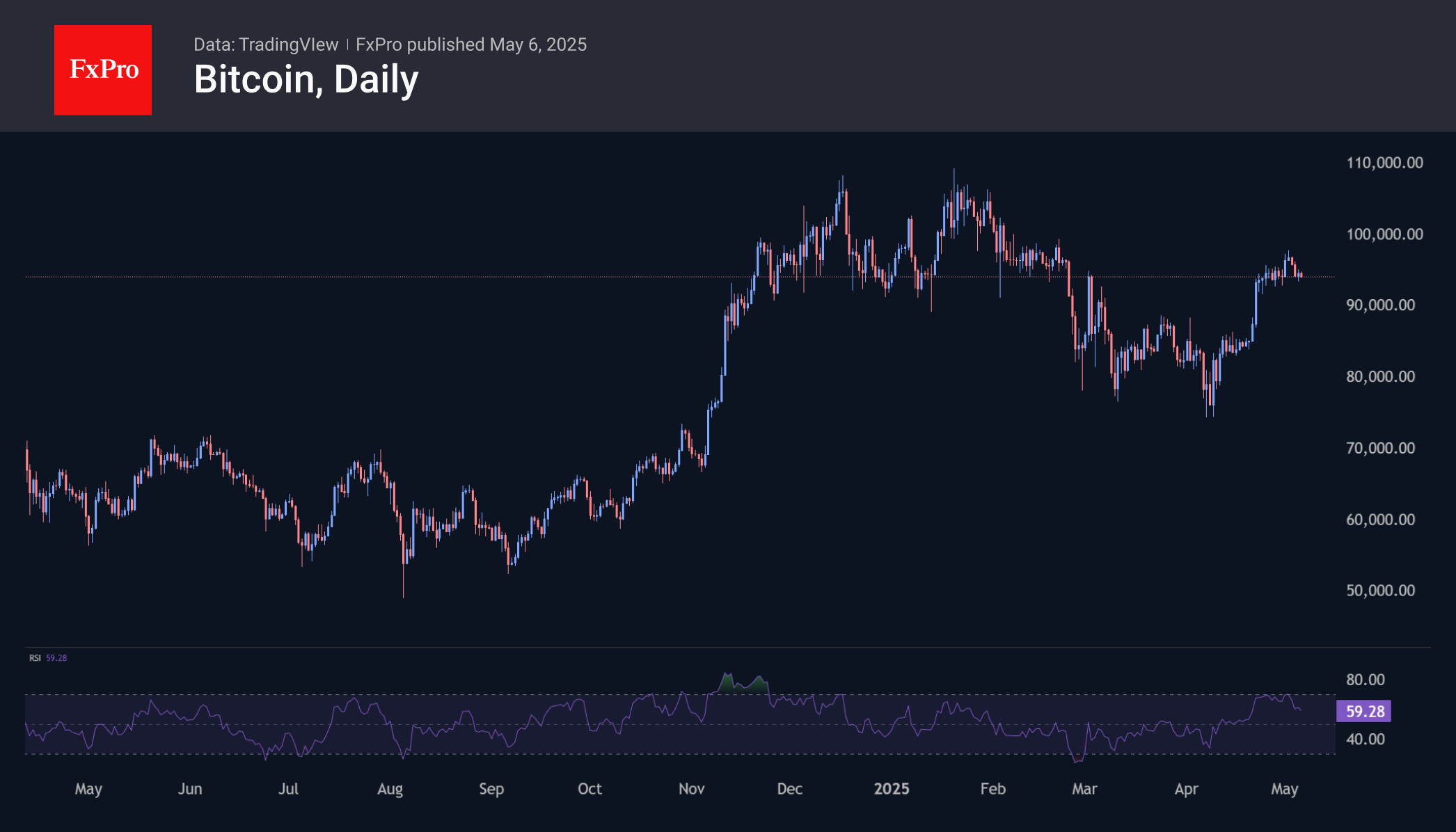 Биткоин же повторяет общее настроение фондовых индексов США, выпуская пар последние дни вслед за всплеском во второй половине апреля. Пожалуй, можно только приветствовать своевременное замедление после касания области перекупленности, так как это расчищает путь для дальнейшего роста.
