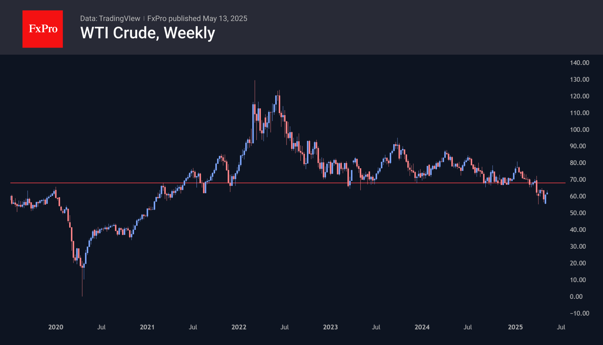 Цены на нефть растут с начала прошлой недели, увеличившись на более чем 12%. Рост происходит благодаря позитивным новостям о переговорах Китая и США по тарифам. Снижение геополитической напряжённости в отношениях Россия-Украина и Индия-Пакистан за последние дни не оказало значительного влияния на котировки. Это может быть связано с недоверием к прогрессу в этих направлениях или концентрацией участников рынка на позитивных новостях.