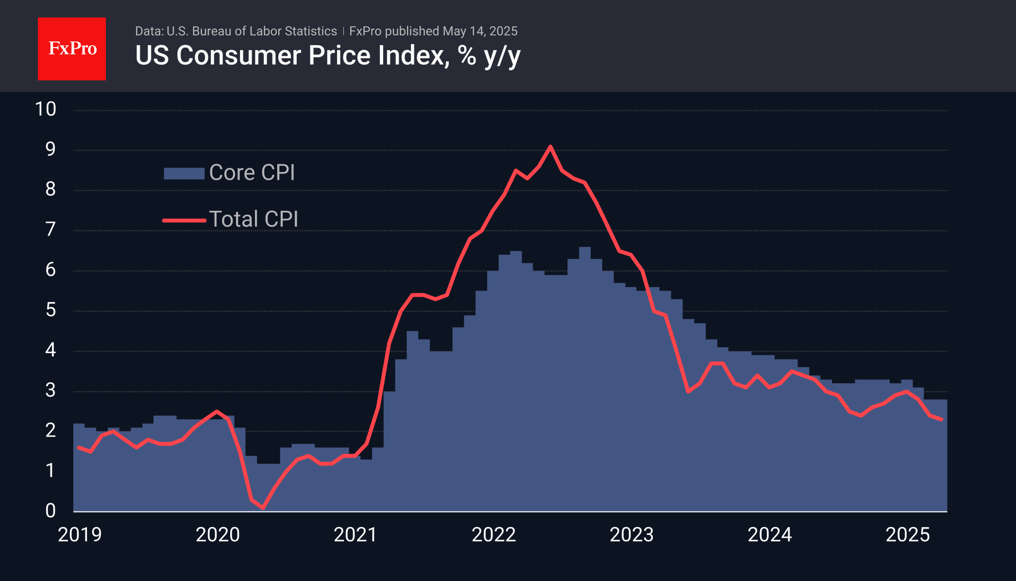 Эти данные мягче запустили новую волну снижения доллара после недели уверенного роста. Причиной такой динамики является смягчение ожиданий по ключевой ставке, шансы на снижение которой пошли в рост. Инвесторы стали меньше опасаться немедленных эффектов от тарифов. При этом многие экономисты указывают, что повышательное влияние на цены будет лишь нарастать в ближайшие месяцы. Даже если тарифы вернуться на уровни до начала апреля, хвостовые эффекты растянутся на ближайшую пару кварталов.