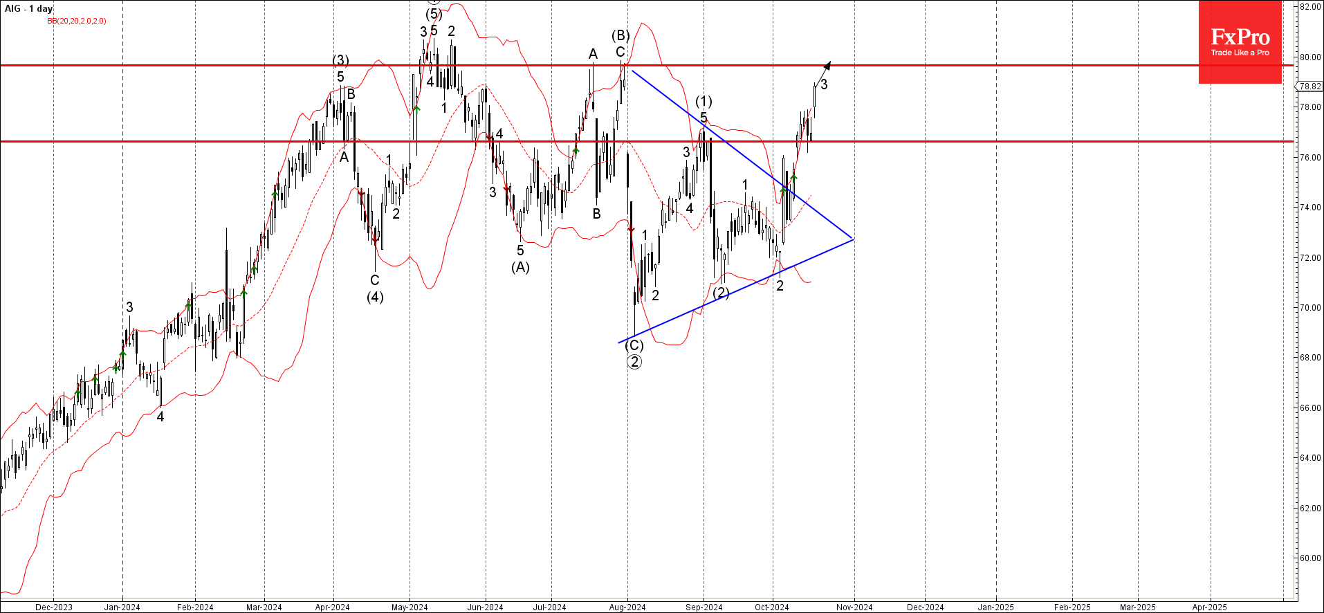 Учитывая явный дневной восходящий тренд, можно ожидать дальнейшего роста AIG к следующему уровню сопротивления 79,65 (бывшая двойная вершина от июля и цель для завершения активной импульсной волны 3).