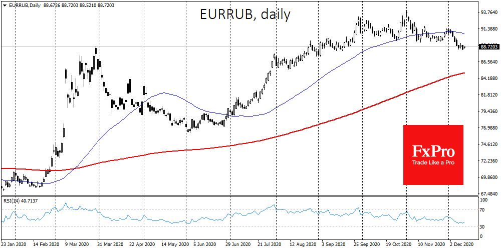 Потенциально USDRUB способна провалиться к 69-70 к концу первого квартала 2021 года, где рубль может натолкнуться на психологическое сопротивление. EURRUB недавно вполне успешно провалилась под важный круглый уровень 90, и потенциально может прийти к 85 еще до конца первого квартала будущего года, оказавшись у своей 200-дневной средней.
