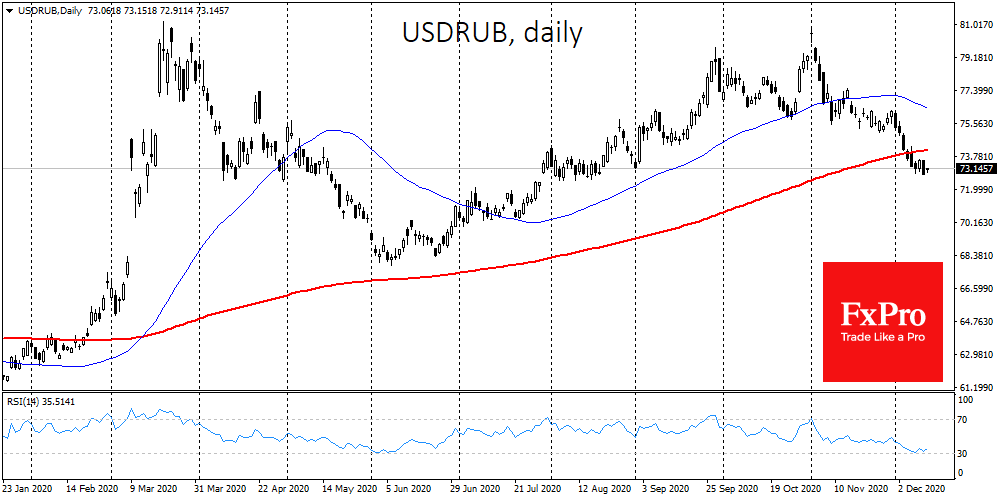 Однако недавний импульс роста рубля, вернее, ослабления доллара был весьма резким, так что сформировалась краткосрочная перепроданность по USDRUB на дневных графиках по индикатору RSI. Как правило, снижение индикатора в область перепроданности заставляет с настороженностью смотреть на возможность снижения в ближайшие дни. Возможен также отскок, при котором 200-дневная средняя (сейчас вблизи 74.10) может выступить в качестве цели коррекции недавнего снижения.
