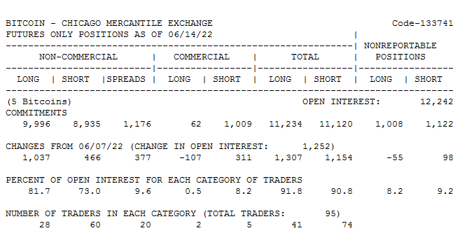 Мелкие спекулянты (NONREPORTABLE POSITIONS) ликвидировали всю чистую позицию на покупку контрактов на биткоин (на 0.04 тыс. контрактов) и открыли чистую позицию на продажу на 0.11 тыс. Чистая позиция стала отрицательной впервые с конца ноября прошлого года.