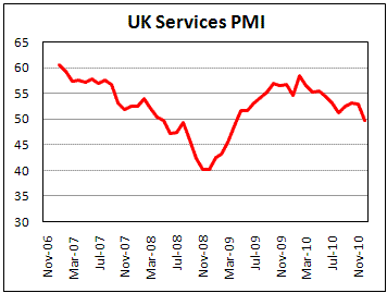 Деловая активность в секторе услуг в Великобритании снизилась в декабре впервые с апреля 2009 года, что может служить знаком резкого замедления экономического роста в стране в конце минувшего года.