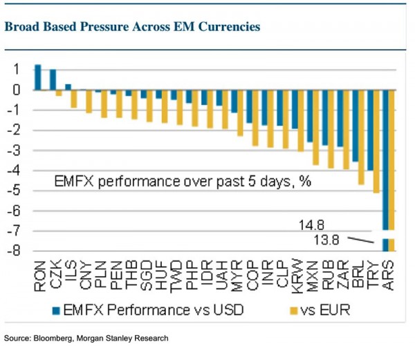 Далее представлен график валют развивающихся рынков против доллара и евро (Bloomberg и Morgan Stanley):