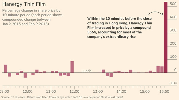 Последние два года стали золотыми для гонконгской Hanergy Thin Film Power Group, компании с капитализацией в размере $35.5 миллиардов, превратившей ее владельца в богатейшего человека в Китае. Анализ FT торговых данных за последние два года торговой деятельности Hanergy Thin Film указывает на то, что акции компании последовательно росли в конце рабочего дня, примерно за 10 минут до закрытия биржи с начала 2013 года до февраля этого года.