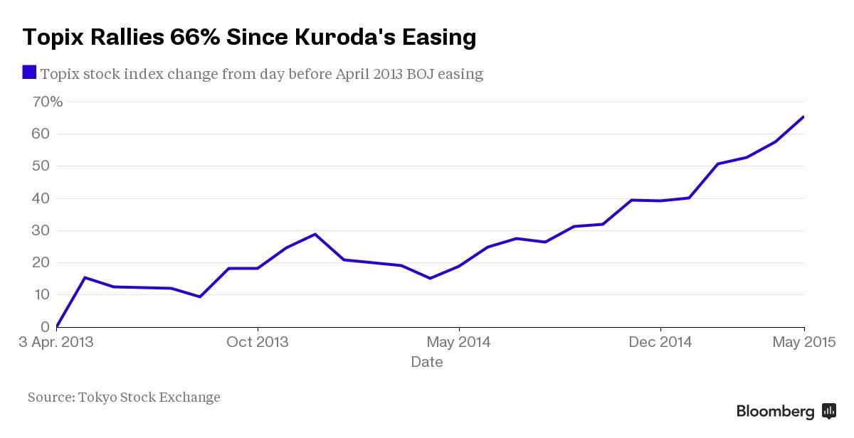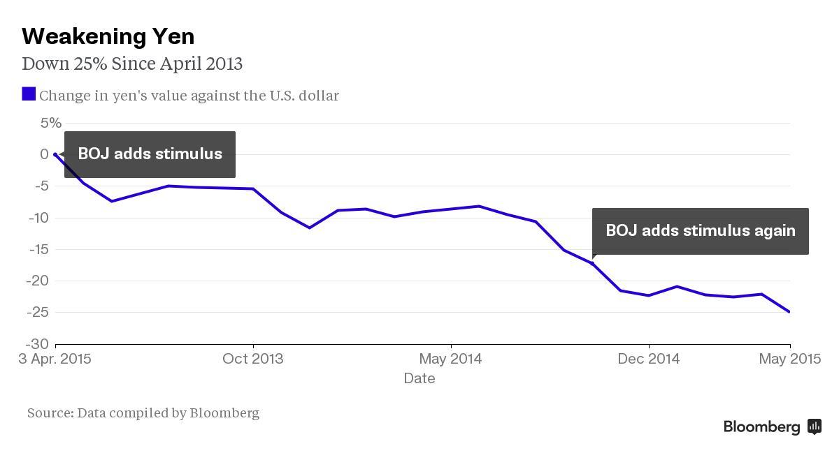 Иена торгуется около 12-ти летнего минимума, потеряв около четверти стоимости с того момента, когда Курода запустил рекордные стимулы. Хотя снижение курса валюты подстегнуло корпоративную прибыль, это также вызвало рост стоимости импорта, что ударило по потребителям и небольшим компаниям.