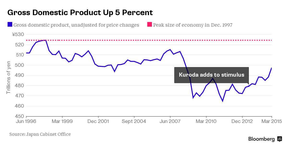 Экономика выросла, тем не менее, она все еще существенно ниже максимума 1997 года. Она лишь медленно восстанавливается после рецессии в прошлом году после того, как правительство премьер-министра Синдзо Абэ повысило налог на продажи.