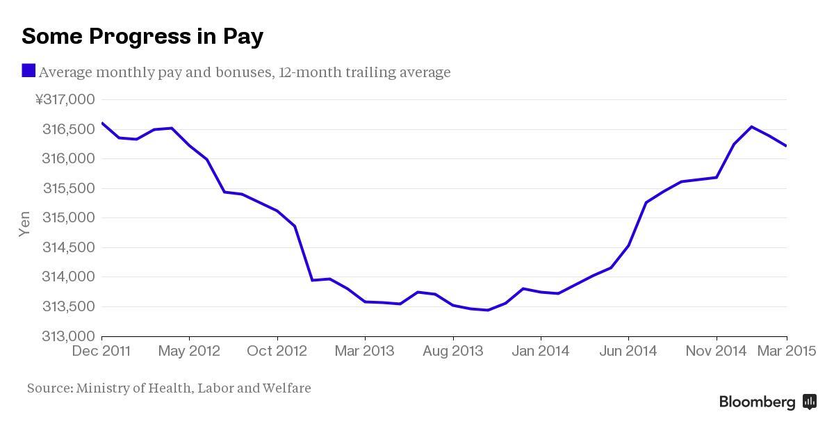 Зарплаты растут. Нужен еще больший рост, чтобы зарплаты соответствовали повышению налога на продажи и планам по приданию импульса инфляции до 2%. Как и с ВВП, зарплаты достигли максимума в 90-х.