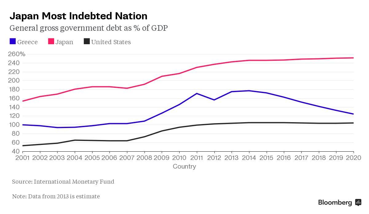 Национальный долг растет, и он сейчас более чем в два раза превышает размеры экономики. Долгосрочные процентные ставки находятся около 0.4%, Банк Японии готов покупать все выпущенные правительством облигации.
