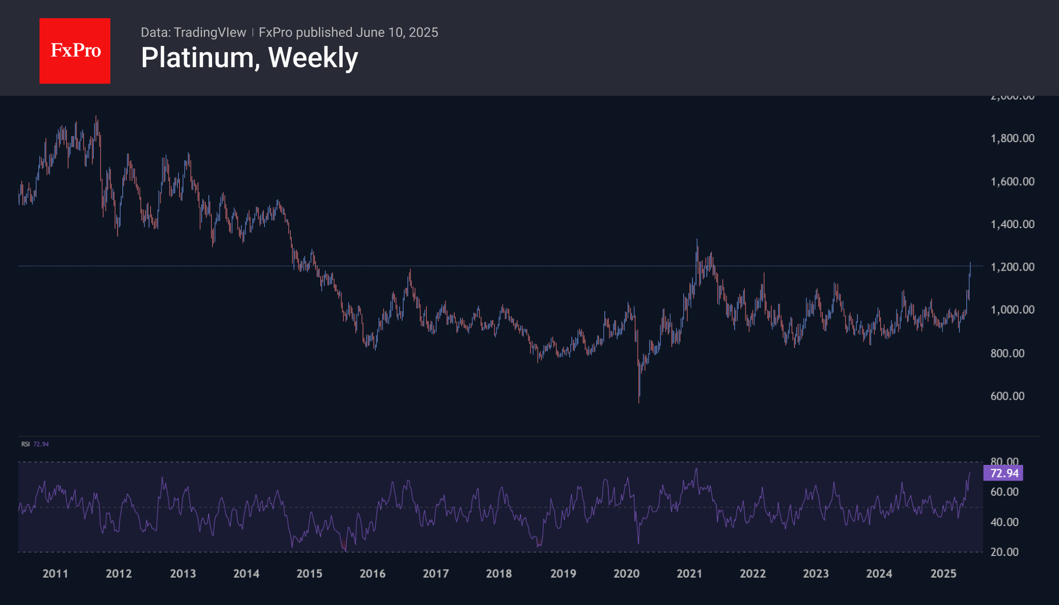 Платина глубоко провалилась в последние годы, выйдя из фокуса инвесторов, так как автомобильная промышленность пыталась уходить от ДВС, где платина активно используется. В последние недели, впрочем, платина выступает альтернативой золоту, как металла для золотовалютных резервов. Впрочем, ей ещё предстоит доказать свой потенциал. В области $1200–1300 проходит поворотная область 2021 года. Успешное преодоление этой области сопротивления открывает путь на $1500 и далее на $1900, которые при бычьем сценарии вполне могут быть достигнуты до конца года.