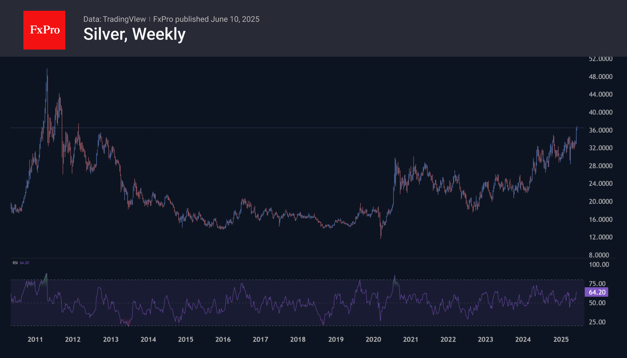 В 2011 году ралли серебра двинуло цену с менее чем $18 до почти $50. В случае сохранения импульса, который драйвит драгоценные металлы с начала года, быки могут нацелиться на повторение пиков пятнадцатилетней давности или даже попытаться их преодолеть. На недельных таймфреймах серебро не перегрето, с RSI на уровне 64. В 2011 и 2018–2019 только превышение 80 по RSI было сигналом разворота.