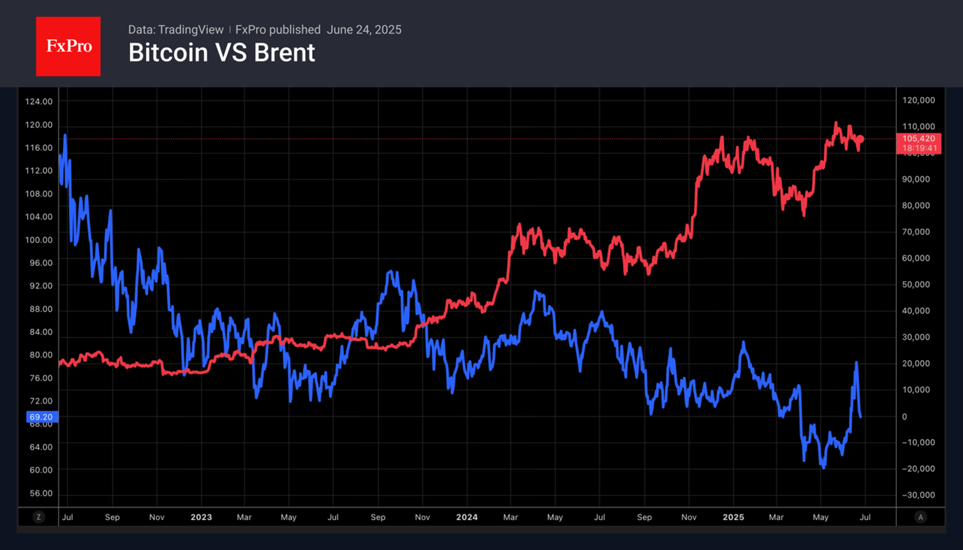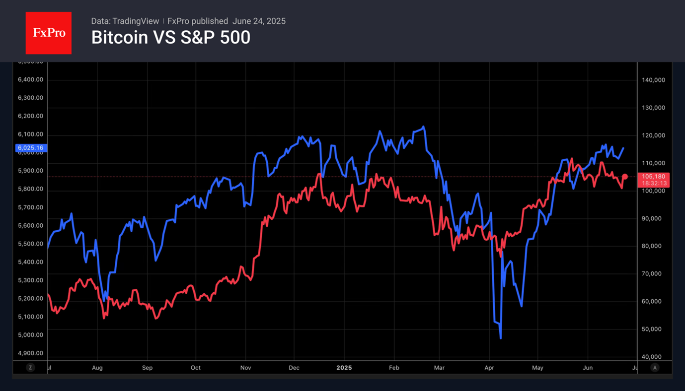 Точка в израильско-иранском конфликте позволяет рассчитывать на продолжение ралли фондовых индексов США. Возвращение S&P 500 в область рекордного максимума усиливает глобальный аппетит к риску и создаёт попутный ветер для BTCUSD. События на Ближнем Востоке показали, что биткойн не стал защитой от потрясений, как это задумывалось создателями.