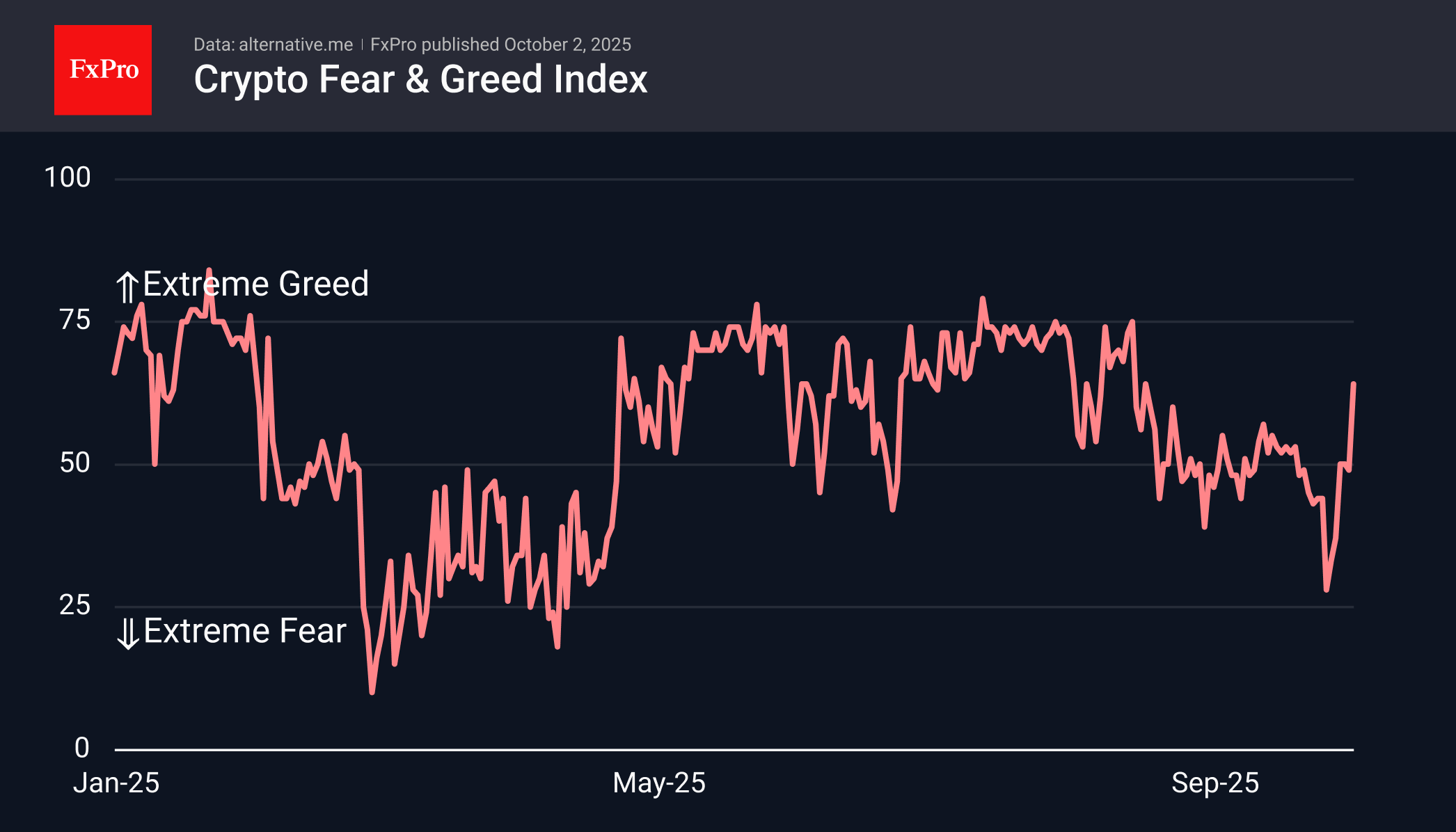 Индекс настроений поднялся до 64 (жадность) оказавшись на максимальном уровне за последние шесть недель. При этом индекс далёк от экстремальной жадности, оставляя значительный потенциал дальнейшего укрепления.