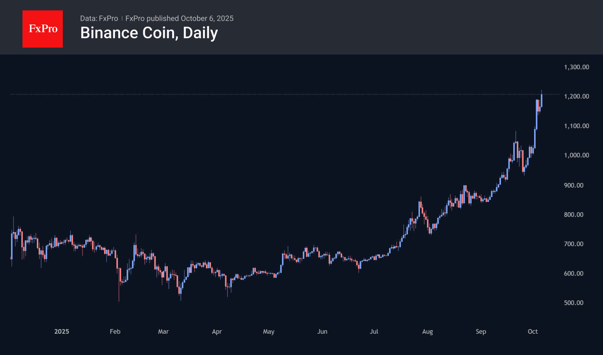 Но есть и отличия от предыдущих месяцев. В июле мощный рост был у XRP, в августе у Ethereum, в сентябре значимый рывок сделала Solana. Однако всё это время был и ясный победитель – BNB, который четвёртый месяц подряд обновляет исторические максимумы, выстрелив на 20% за семь дней и на 40% за 30 дней с новым рекордом на $1220, установленным в понедельник.