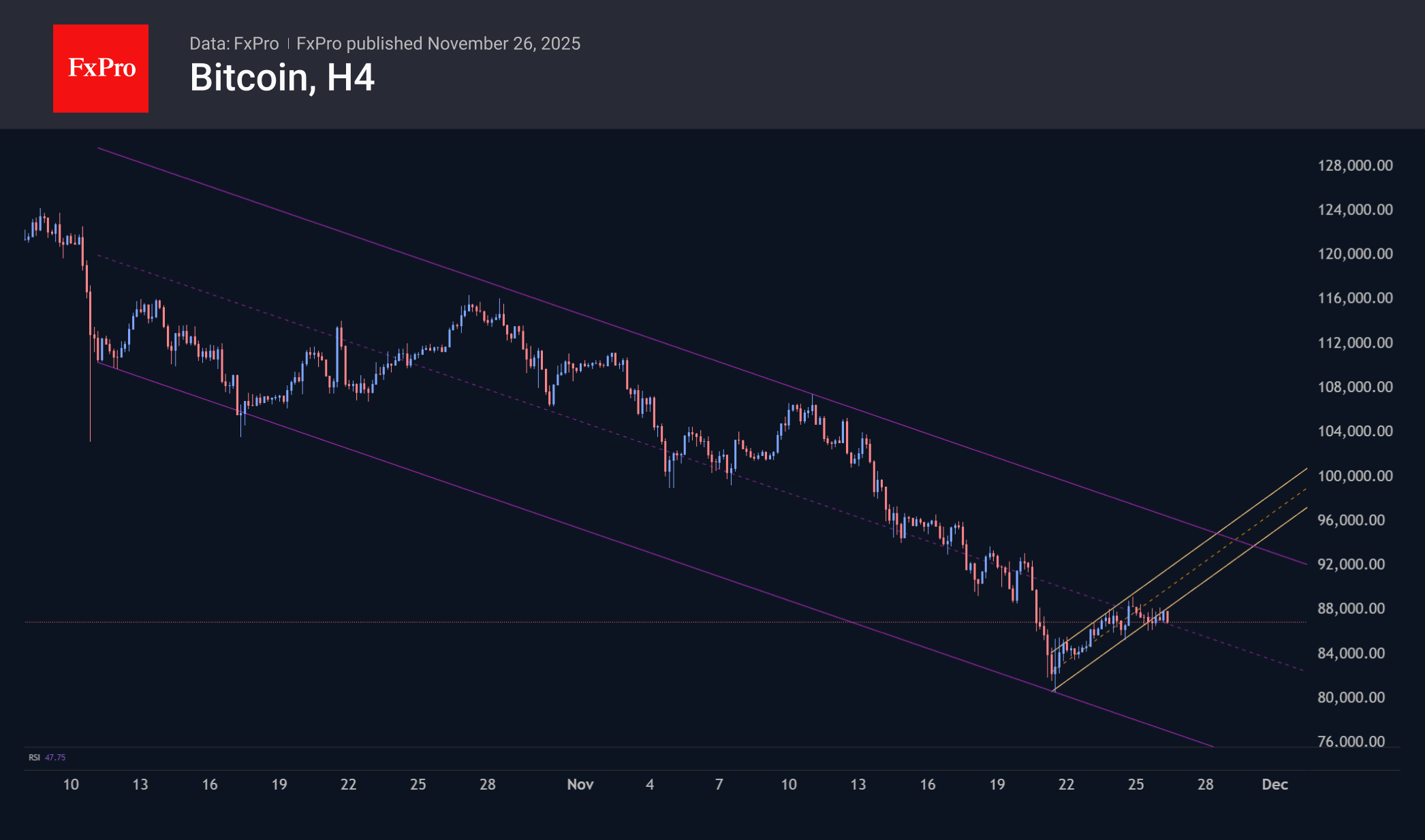 Биткоин торгуется вокруг $87K последние три дня. Восстановительный отскок потерял силу, но и медведи не перешли к активным действиям из-за повышения аппетита к риску на глобальных площадках и умеренного ослабления доллара, что есть идеальная питательная среда для криптовалют. Мы продолжаем отмечать слабость криптовалют, учитывая благоприятный инвестиционный фон, что заставляет искать причины в более долгосрочных процессах, таких как фиксация прибыли после бурного роста последних двух лет.