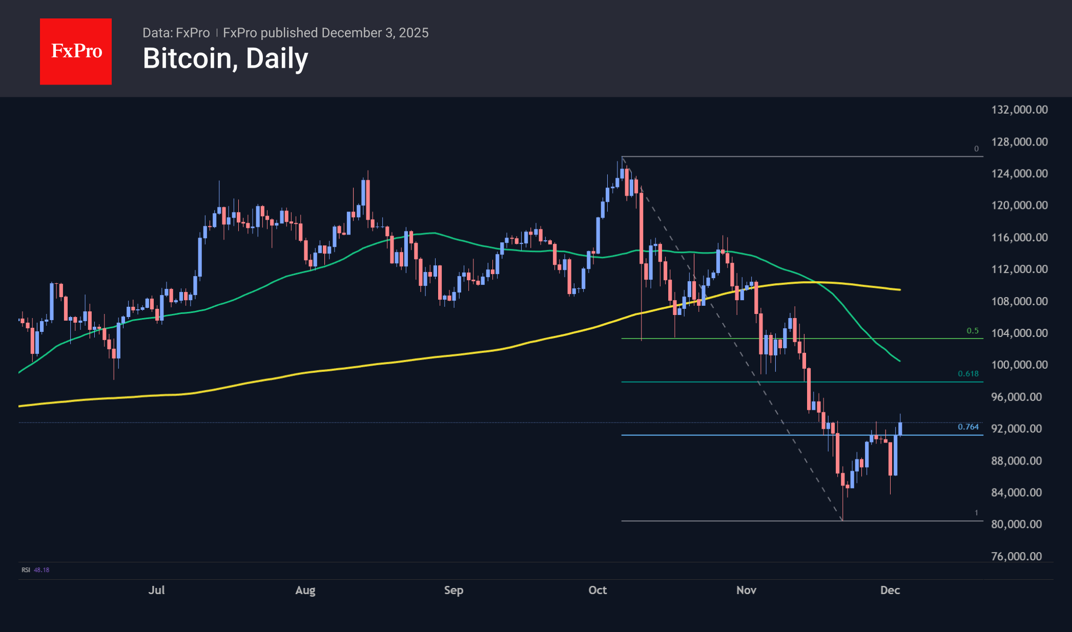 Биткоин приближался к $94K утром в среду, отыграв половину потерь с распродажи с 11 по 21 ноября. Если рассматривать всё снижение от пика в октябре, BTCUSD в рамках коррекции пока торгуется ниже $98K. В области $98-100K сосредоточен ряд психологически значимых уровней – 50-дневная средняя, поддержка начала ноября и 61.8% от снижения с пика. Закрепление выше способно убедить покупателей, что крипто-зима не наступила.