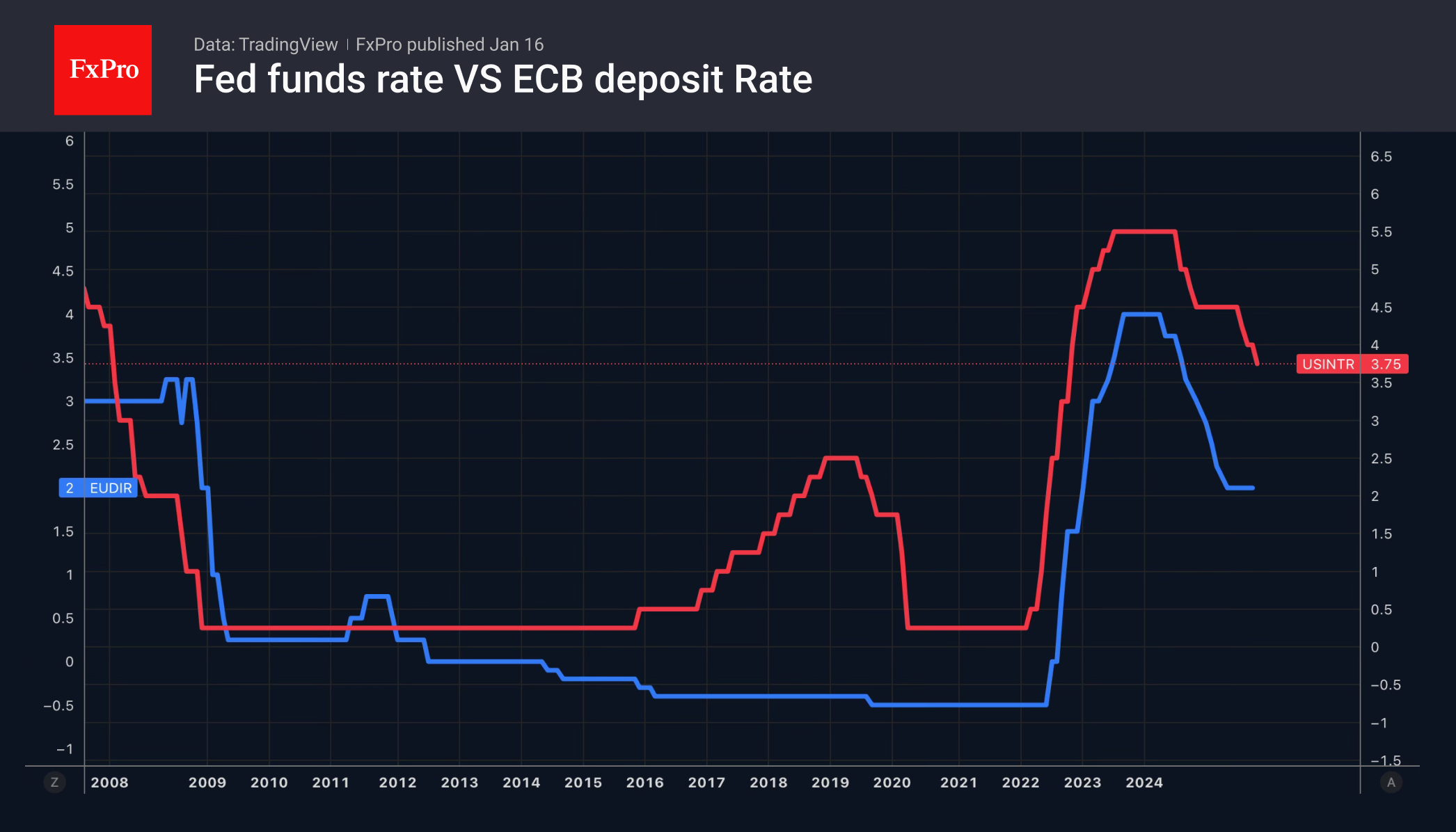EURUSD падает на протяжении 11 из последних 15 торговых сессий и достигла самого низкого уровня с начала декабря. По мнению Credit Agricole, идея дивергенции монетарной политики ФРС и ЕЦБ не будет реализована. Федрезерв оставит ставки неизменными в 2026, а широкий дифференциал ключевых ставок станет главным оружием доллара США. Bank of America предупреждает, что недовольство ЕЦБ динамикой инфляции может вынудить его возобновить цикл смягчения политики. Это окажет давление на евро.