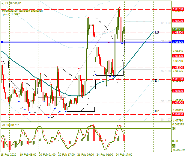 Пара EUR/USD в понедельник торговалась выше линии баланса (LB), тестируя линию U1.