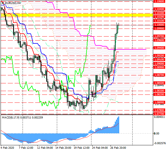 Пара EUR/USD взлетела в четверг к 3-недельным максимумам около уровня 1.10, показав максимальный дневной рост за последние два года (+1,09%). Пара поднялась выше облака Ишимоку на 4-часовом графике.