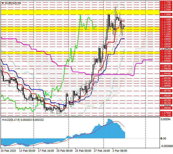 Пара EUR/USD снизилась в среду после очередной неудачной попытки преодолеть зону сопротивления 1.1180-1.12. Пара опустилась ниже линии Tenkan на 4-часовом графике; снизу поддержку снова оказал уровень 1.11.