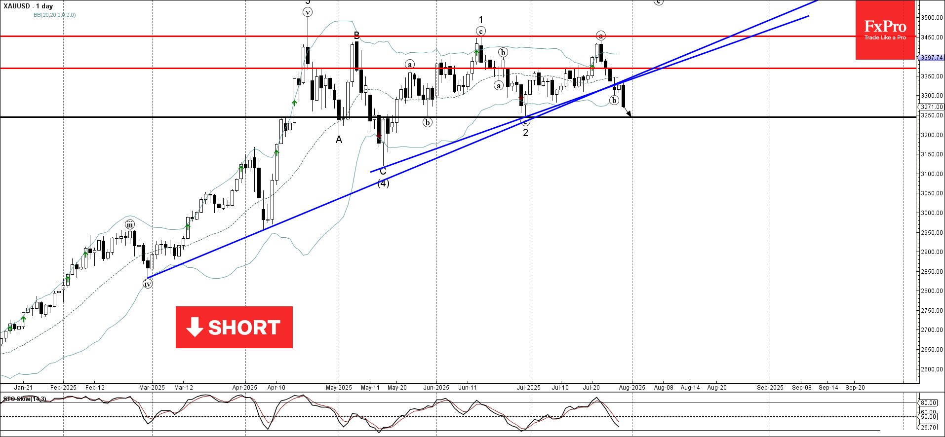 Золото находится под медвежьим давлением после того, как цена прорвала две восходящие линии поддержки от мая и февраля.