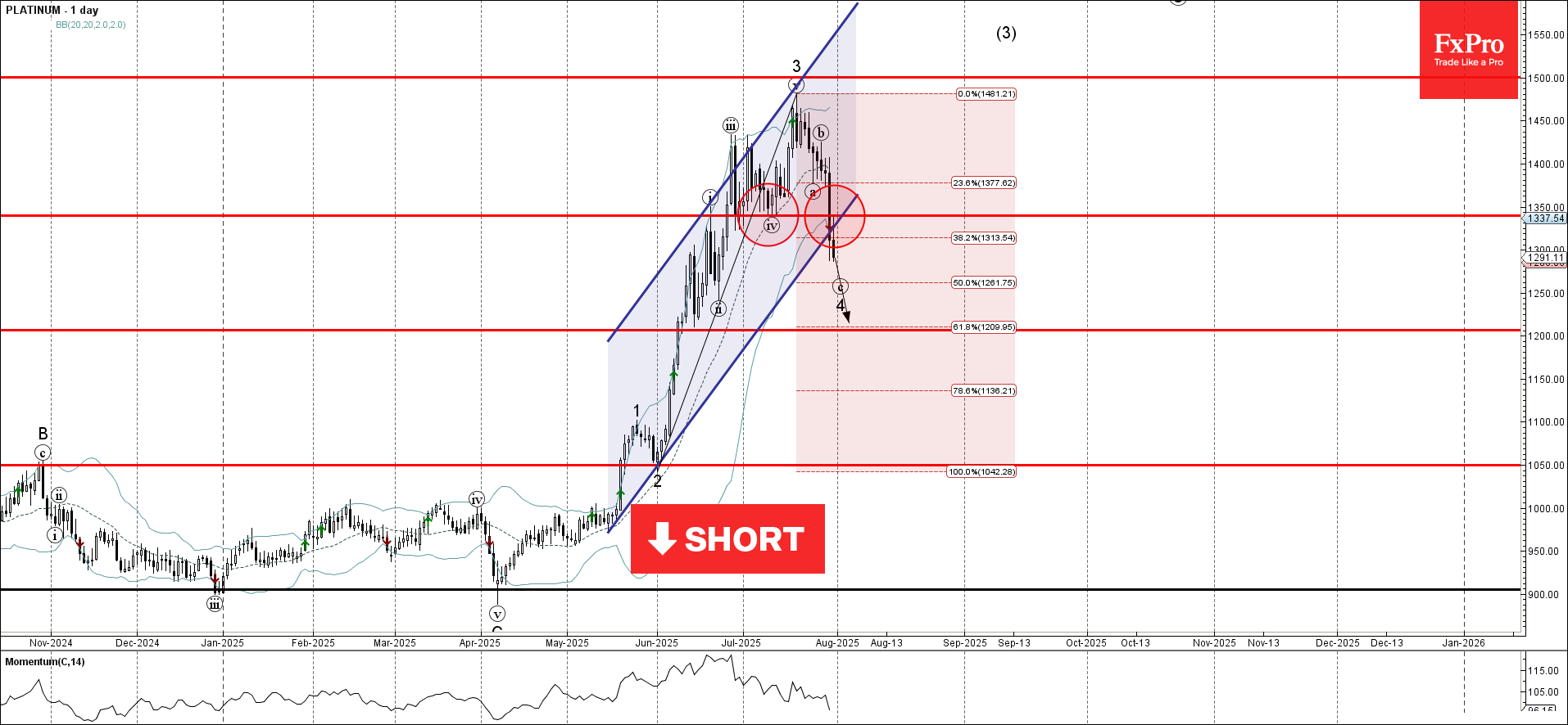 Платина прорвала зону поддержки, расположенную между ключевым уровнем поддержки 1340,00 (дно предыдущей коррекции iv) и линией поддержки дневного восходящего канала от мая.