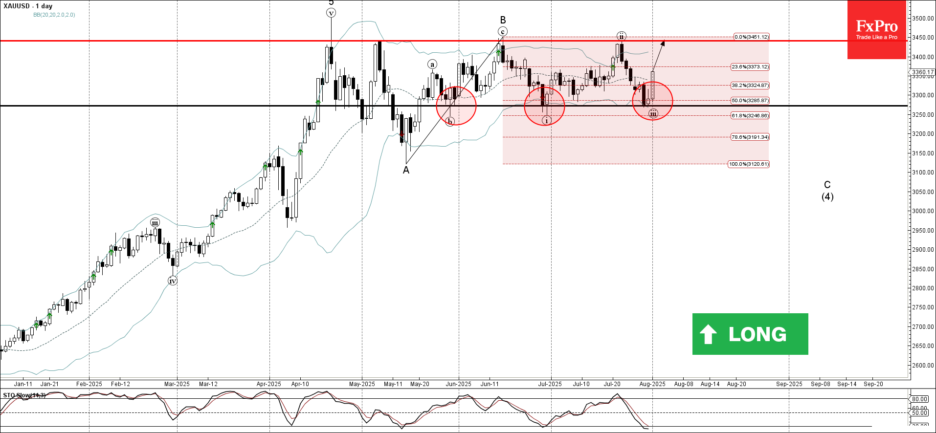 Золото развернулось от зоны поддержки между уровнем поддержки 3272,00 (который разворачивает цену с конца мая), нижней дневной полосой Боллинджера и 50% коррекцией Фибоначчи восходящей волны B, начавшейся в мае.