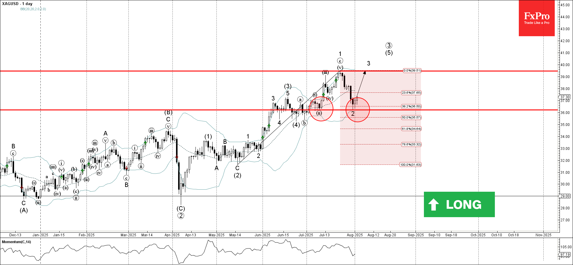 Серебро недавно развернулось от зоны поддержки между уровнем поддержки 36,20 (который также остановил волну 2 в начале июля), нижней дневной полосой Боллинджера и 38,2% коррекцией Фибоначчи восходящего импульса от мая.