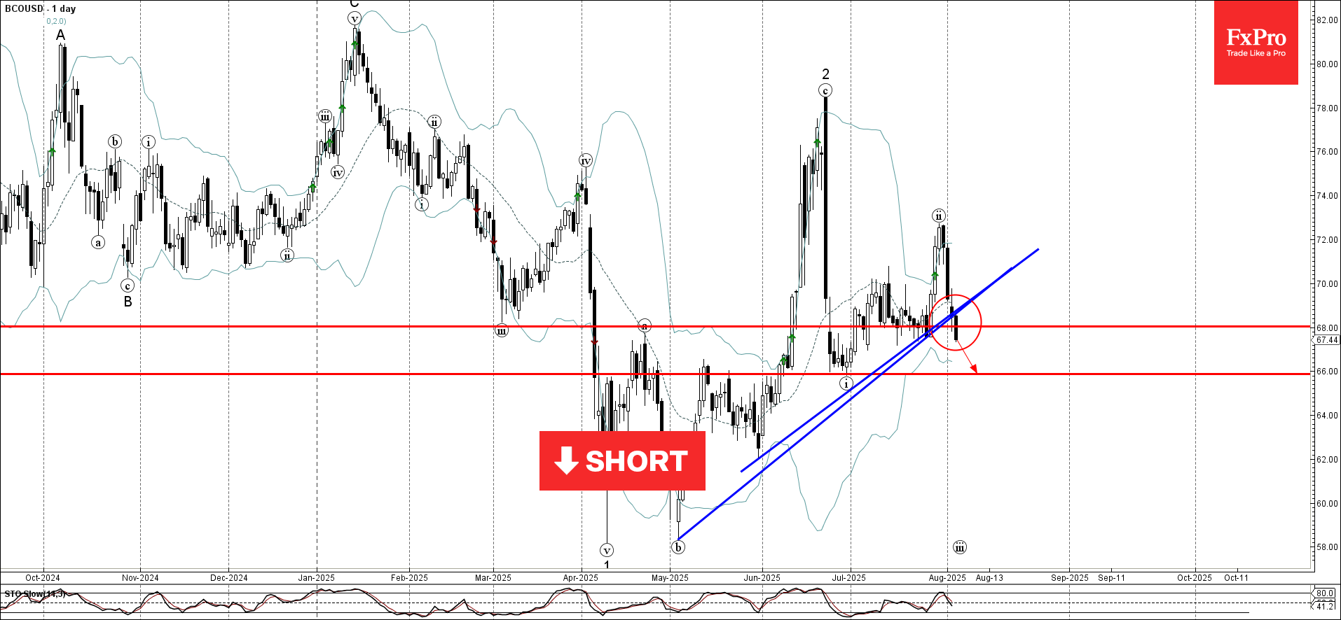 Нефть марки Brent недавно прорвала зону поддержки между ключевым уровнем поддержки 68,00 (который несколько раз разворачивал цену в июле) и двумя линиями поддержки от мая.