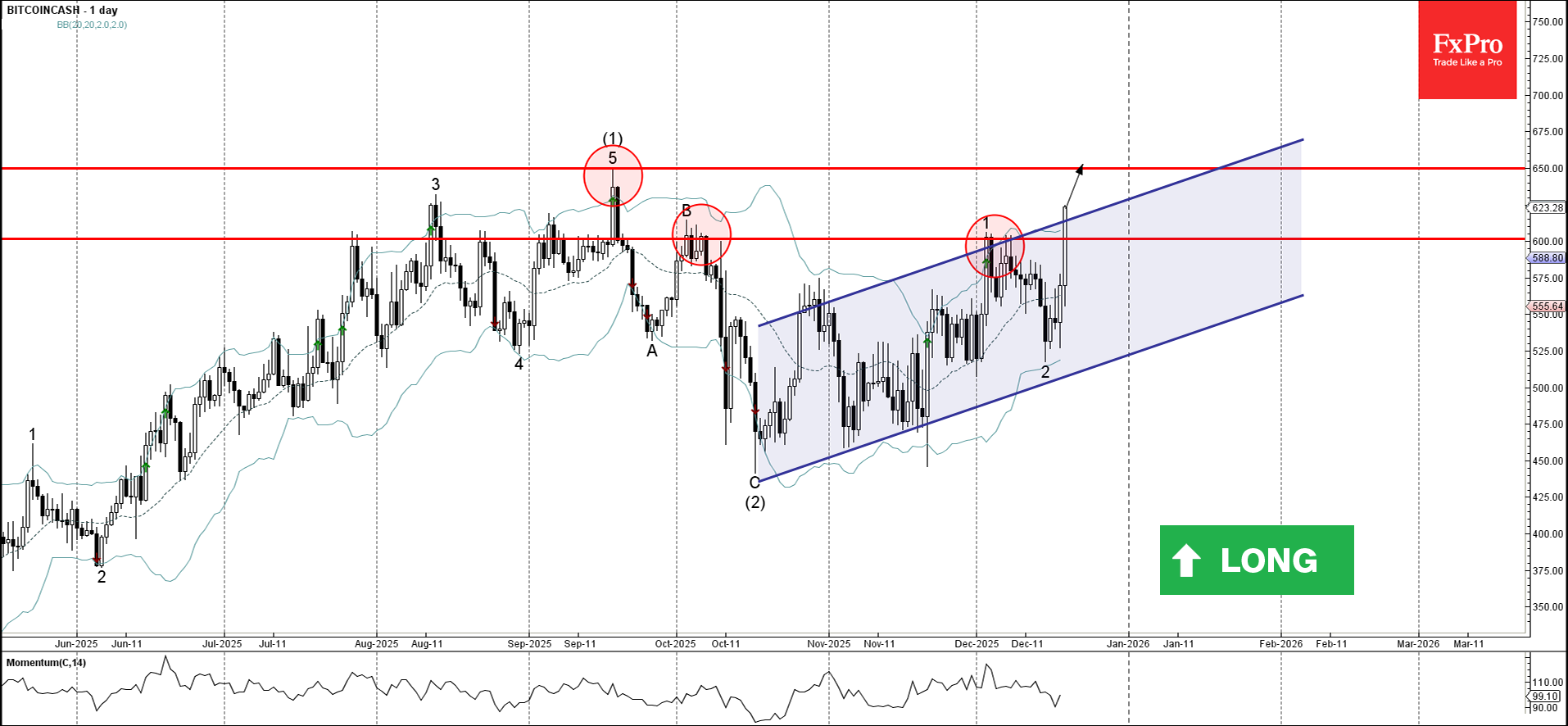 Ожидается, что криптовалюта Bitcoin Cash продолжит рост до следующего уровня сопротивления 650,00 (предыдущая многомесячная вершина от сентября, который остановил предыдущую волну (1)).