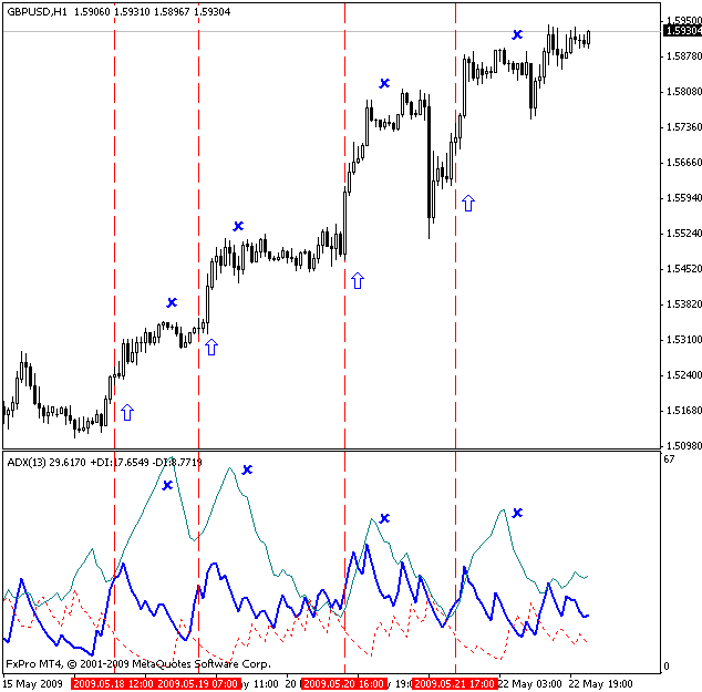 Сигнал на покупку формируется тогда, когда +DI поднимается выше - DI и при этом сам ADX растет.