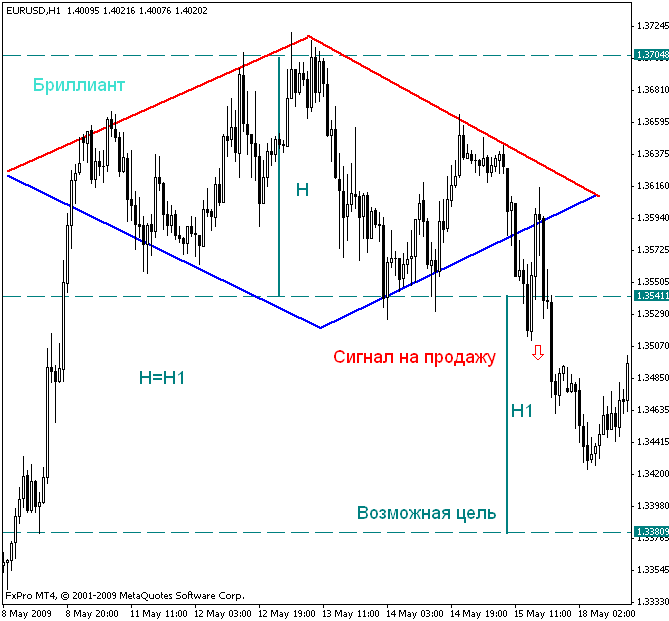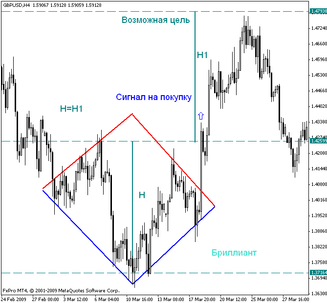 Теория технического анализа гласит, что после пробоя фигуры бриллиант потенциальная величина дальнейшего движения будет равна высоте бриллианта (расстоянию от максимума до минимума), которая откладывается от точки пробоя в соответствующую сторону.