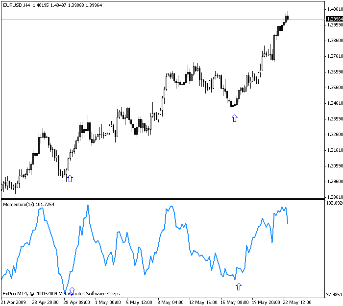 1. Сигнал на покупку формируется в случае, когда индикатор моментум образует впадину, после чего разворачивается и начинает расти.