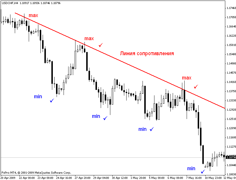 Линия, которая проходит через максимумы образует линию тренда. Еще ее называют линией сопротивления, по той причине, что когда цены достигают ее, то находят там сопротивление, отбиваются от него и снова начинают снижаться.