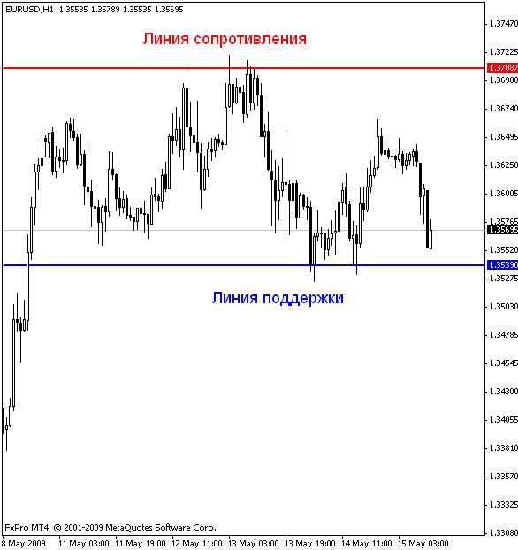 Ну и наконец, что бы определить боковой тренд, то необходимо найти на графике период, когда у цены нет определенного направления движения цены. Линия сопротивления с одной стороны ограничивает рост цен, а линия поддержки не дает ценам снижаться. Этот период очень полезен для трейдеров, поскольку после выхода цен из бокового тренда происходят сильные колебания цен, из которых можно извлечь солидную прибыль.