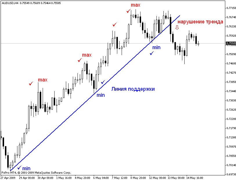 Линия, которая проходит через минимумы образует линию тренда. Еще ее называют линией поддержки, по той причине, что когда цены достигают ее, то находят там поддержку, отбиваются от нее и снова начинают рост.