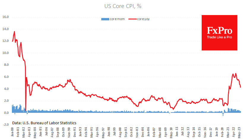 Стержневой индекс цен – без учёта энергии и еды – прибавил 0.3% м/м после двух месяцев роста по 0.2%. Годовой темп роста при этом замедлился с 4.7% до 4.3%. Хотя годовые темпы продолжают падать, они остаются повышенными. За шесть месяцев стержневая инфляция выросла на 1.8%. Это вдвое выше средних годовых темпов за 10 лет до пандемии.