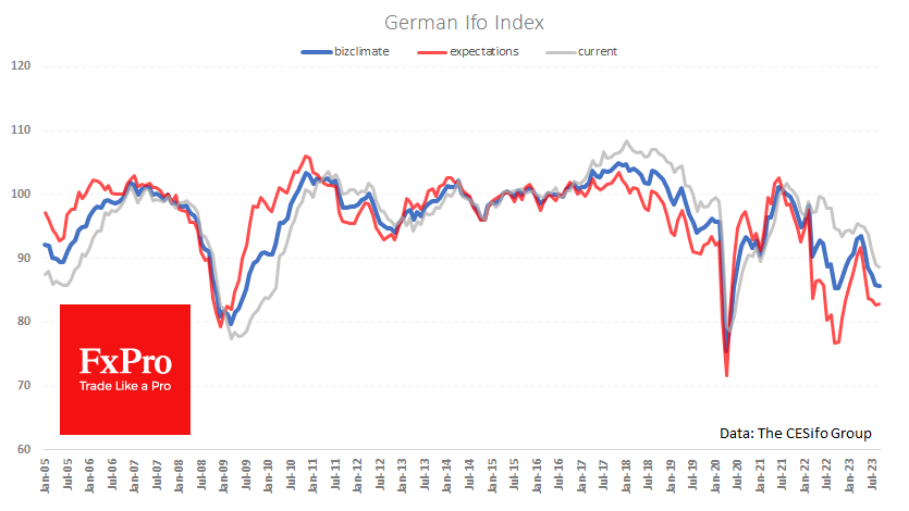 Индикатор делового климата снизился с 85.8 до 85.7, что лучше ожидавшихся 85.1, но всё же является минимумом с середины 2020 года. Исключая этот flash crash, в современной истории настроения были хуже лишь на протяжении девяти месяцев с ноября 2008 по июль 2009.
