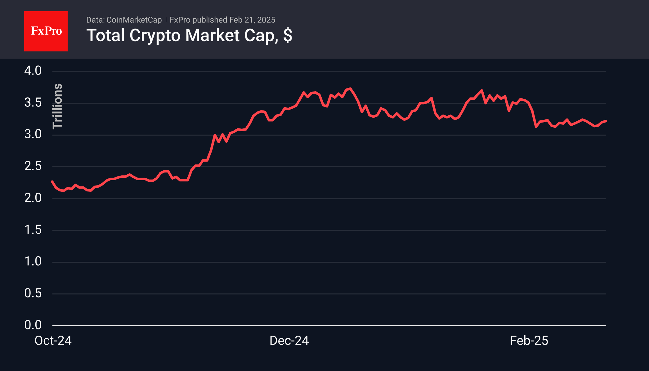 Криптовалютный рынок прибавил 1.3% за последние 24 часа до $3.24, приблизившись к верхней границе консолидационного диапазона после обвала в начале февраля. Только способность расти выше $3.3 трлн. будет сигналом выхода из консолидации и стать прологом для возвращения в область $3.50 или выхода на исторические максимумы у $3.70.