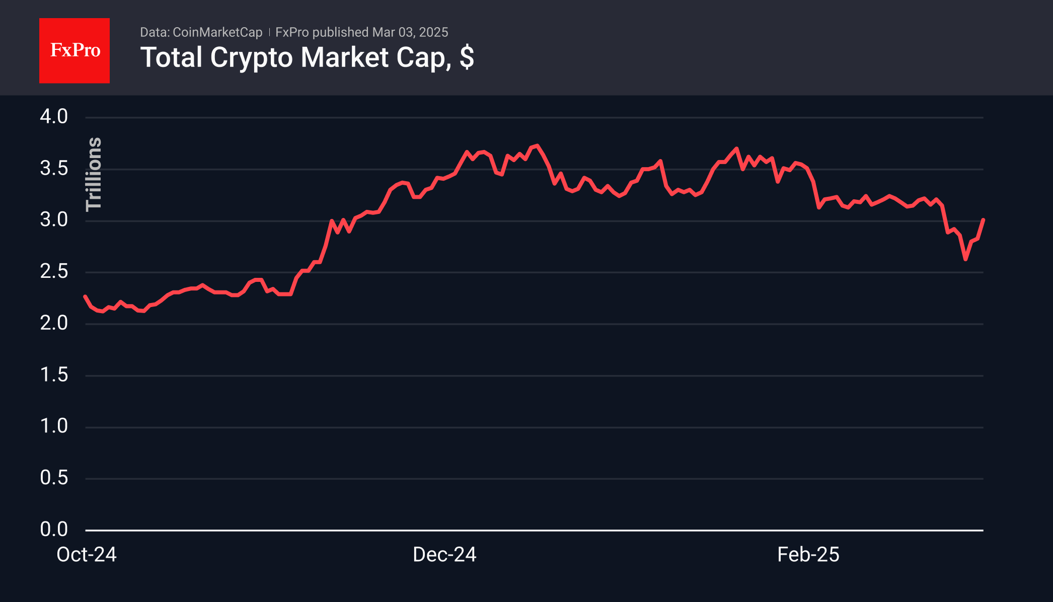 Криптовалютный рынок оживился в воскресенье на внезапном напоминании Трампом идеи создать крипторезерв в США и созыве первого крипто-саммита 7 марта. Капитализация рынка превышает $3 трлн., а на пике поднималась до $3.15 трлн. против минимумов на $2.63 трлн. на старте дня в пятницу. Этот почти 20% рост в значительной степени объясняется малоликвидным рынком, и стоит обращать внимание, какая часть этих достижений сохранится до конца дня в понедельник.