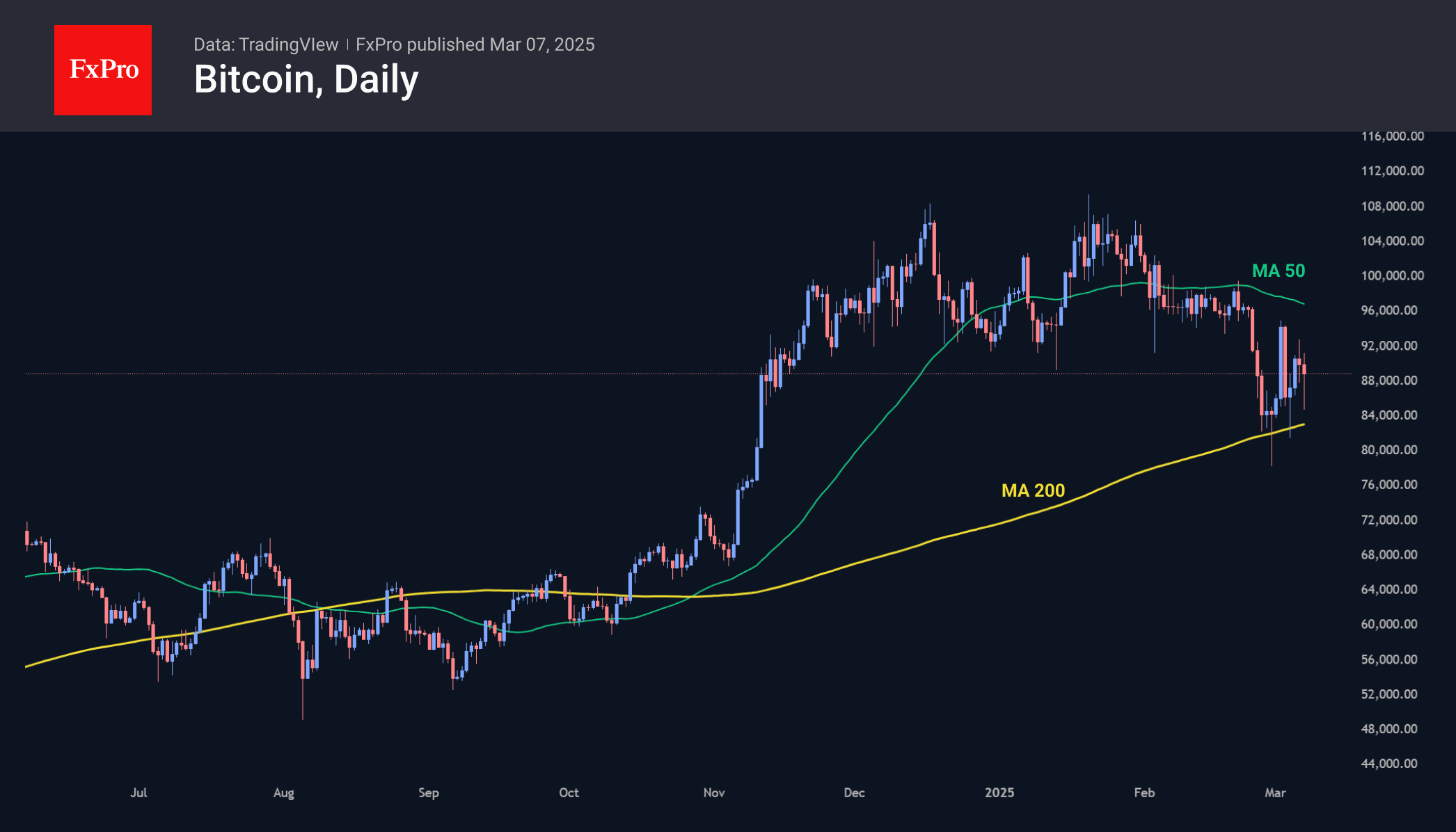 Новости последней недели помогают создавать поддержку на спадах в Биткоине, который в пятницу поднимался до $90 тыс. BTCUSD остаётся зажатым между 50 и 200-дневной скользящими средними. Длинная скользящая средняя играет роль повышающейся поддержки, в то время как короткую мы рассматриваем в качестве сигнальной линии. Способность закрепиться выше 96000 в начале следующей недели будет сигналом окончания коррекции. Но мы предупреждаем, что повышенная волатильность на новостях и низкая ликвидность на выходных могут одурачить трейдеров.