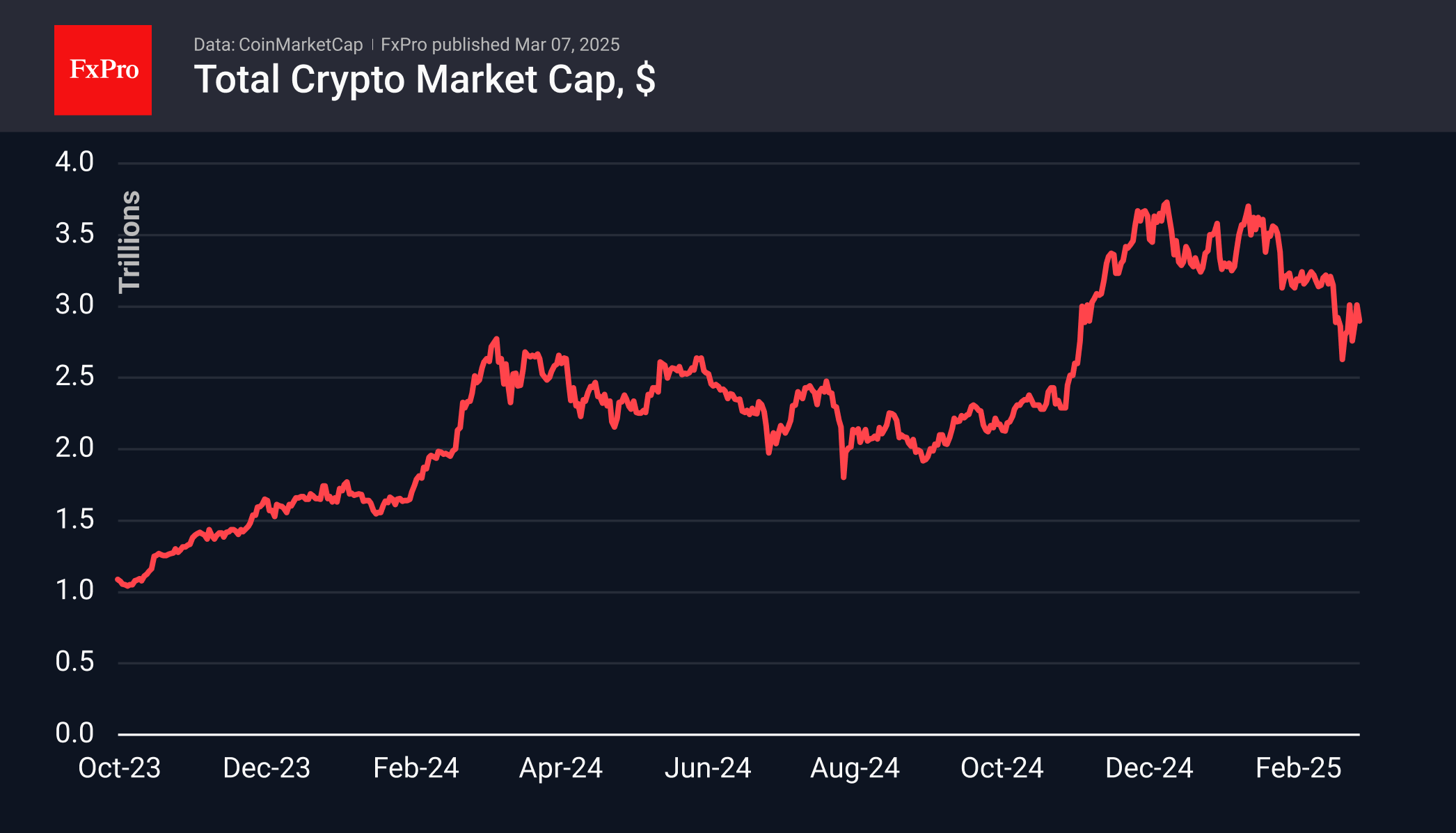 Криптовалютный рынок стал капризным. Ни внезапное объявление Трампом создания крипто-резерва, ни его довольно неожиданное подписание в четверг, до запланированной встречи с крипто-боссами в пятницу, не смогли однозначно подстегнуть рынок. Крипторынок на 8% выше уровней 7 дней назад, но мощно распродаётся при попытках роста. В результате предыдущий уровень поддержки вблизи $3.14 трлн. выступает сопротивлением.
