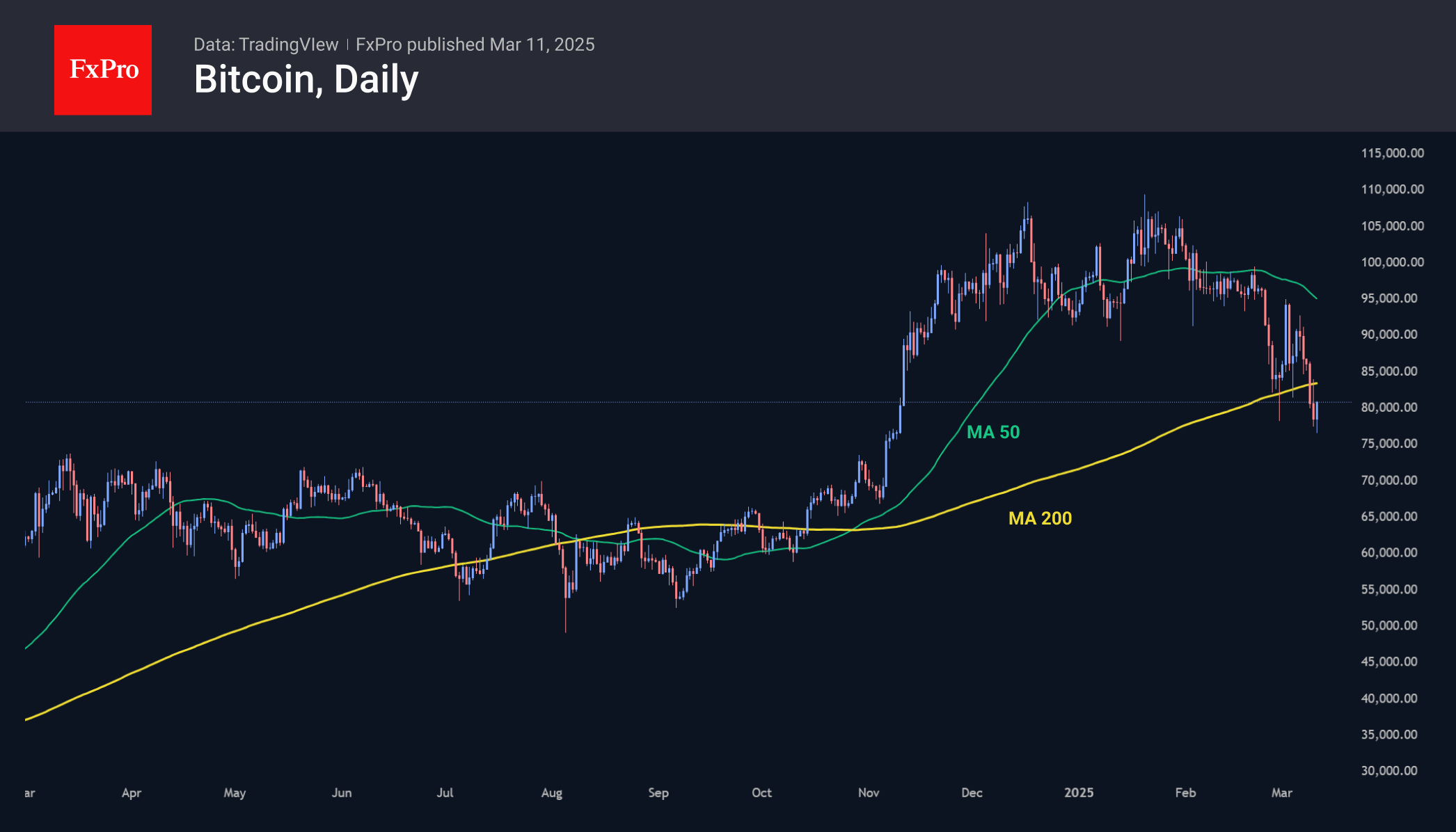 Биткоин проскальзывал в первые часы вторника к $76.5K, но на момент написания всплыл выше $80K, приблизившись к уровням консолидации понедельника. На дневных таймфреймах сохраняется медвежий паттерн, в рамках которого предполагается усиление распродажи после провала под 200-дневную скользящую среднюю. Сценарий отката в область $70-74K по-прежнему выглядит для нас наиболее вероятным. Это тем более верно, что консолидация и отскок в начале марта убрали краткосрочную перепроданность с рынка.