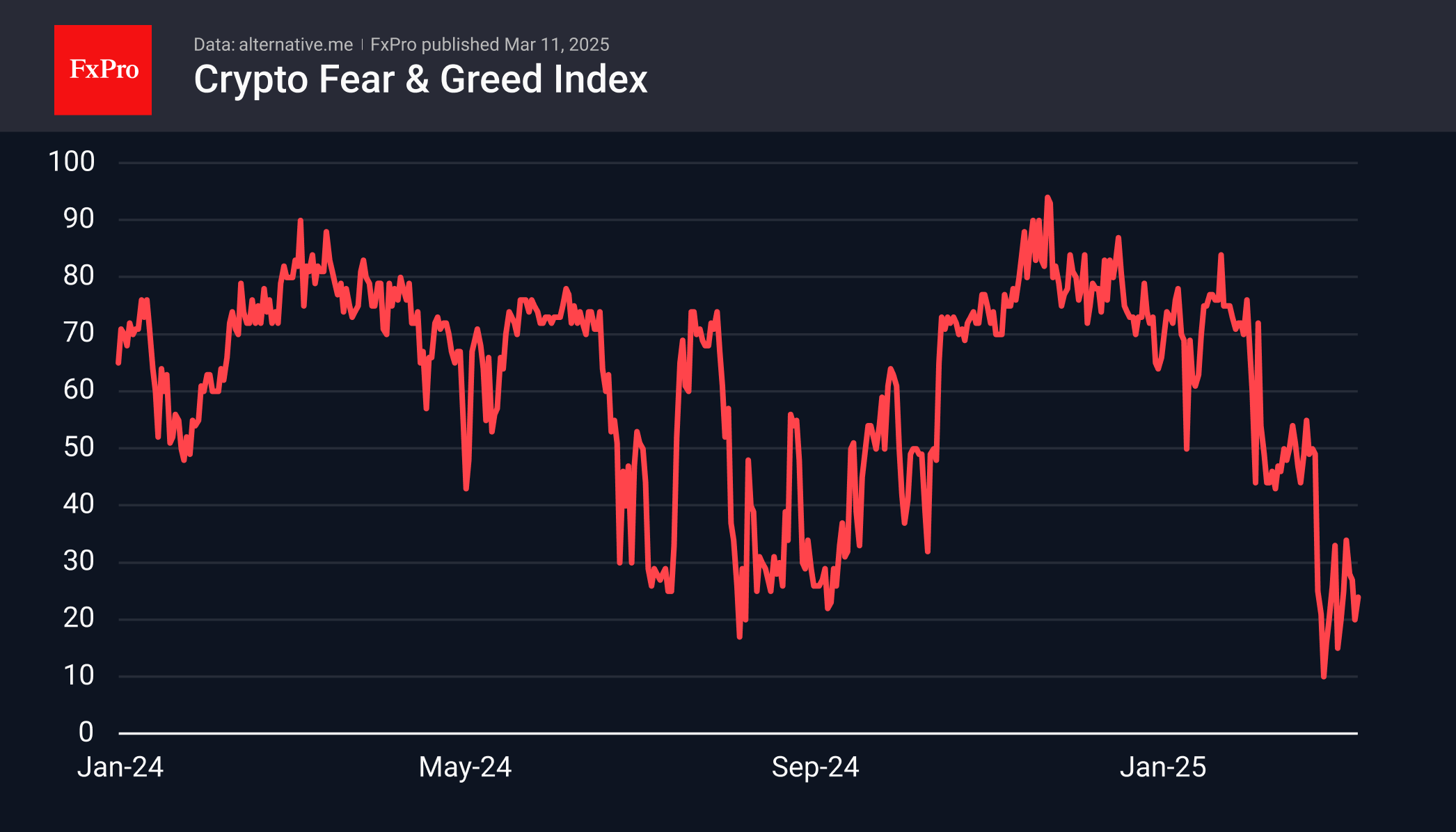 Впрочем, пока мы можем утверждать, что в крипте сейчас меньше ужаса. Индекс страха и жадности на уровне 24 (+4 пункта за день), а минимальная точка была неделей ранее на уровне 10.