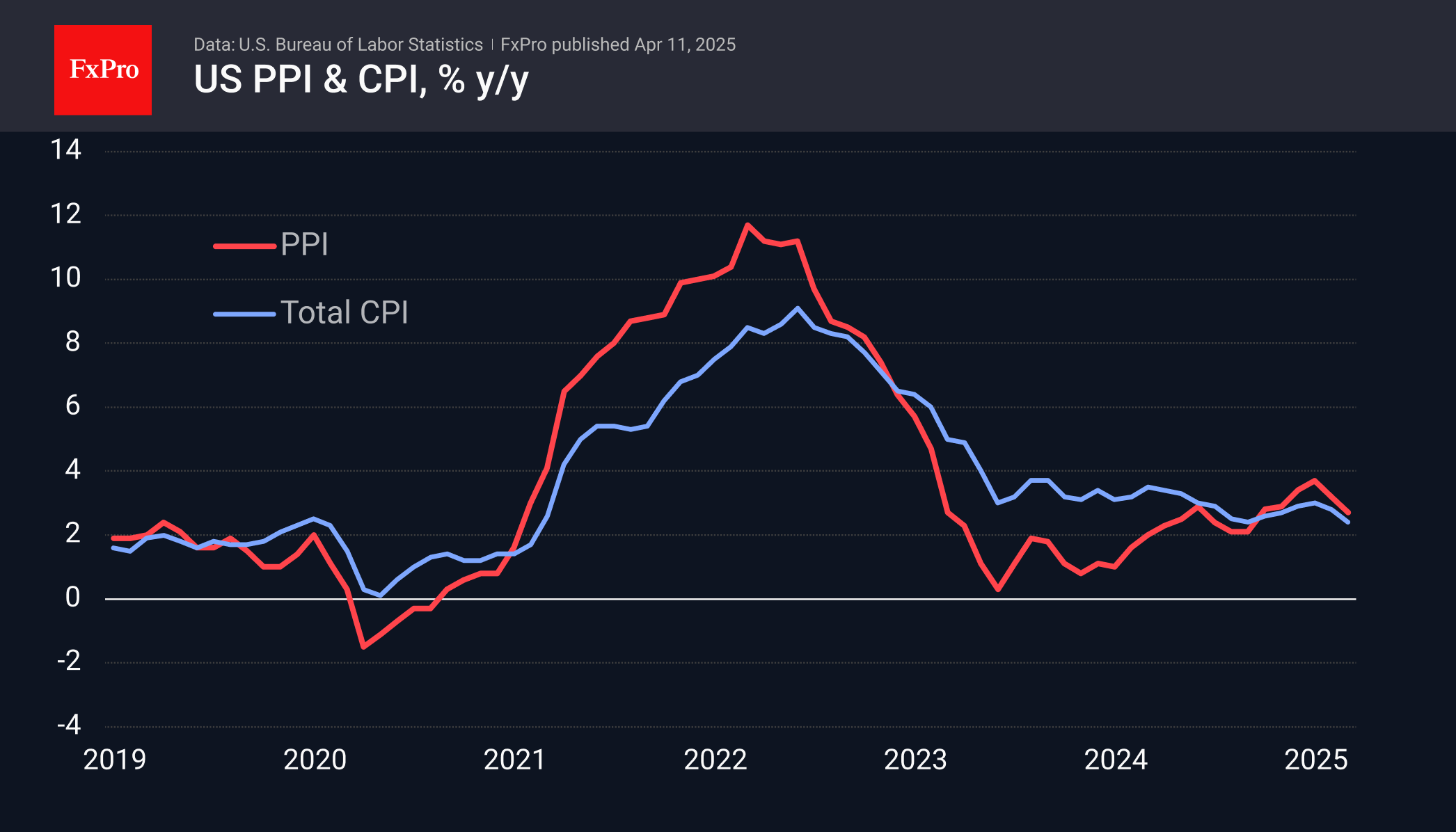 Потребительские цены за март снизились на 0.1%, а годовой темп инфляции - до 2.4%, против ожидавшихся +0.1% и 2.5%, соответственно. Опубликованные в пятницу показатели цен производителей ещё значительней разошлись с ожиданиями. Общий индекс цен снизился на 0.4% против ожидавшегося роста на 0.2%. Годовая инфляция замедлилась с 3.2% до 2.7% против средних прогнозов на ускорение до 3.3%.