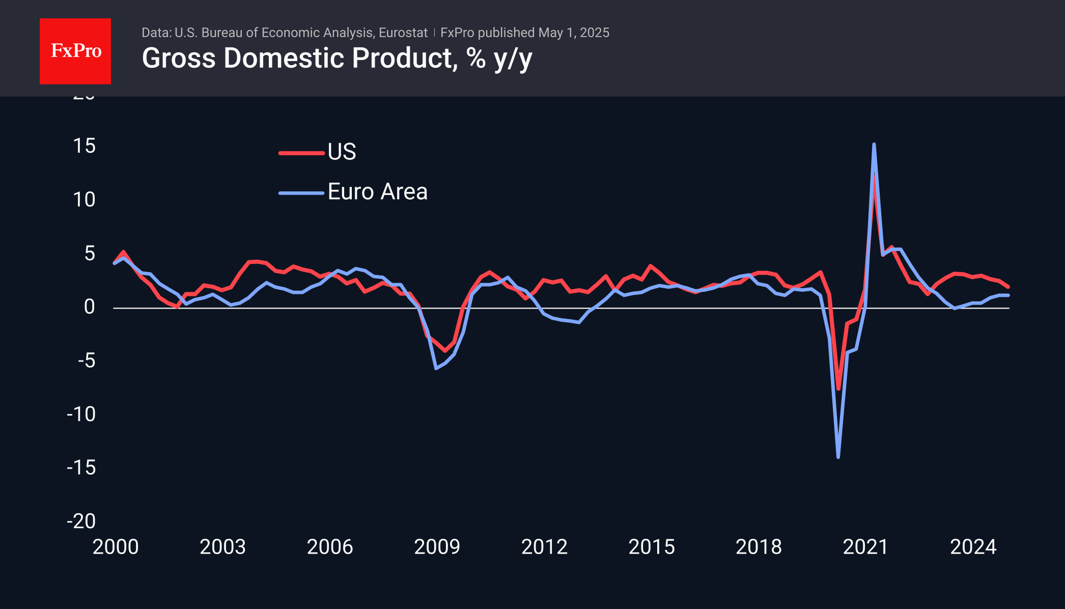 Согласно первой оценке, экономика США сократилась за первый квартал на 0.3% в аннуализированном исчислении (изменение к прошлому кварталу, умноженное на 4). Первоначально эта цифра вызвала шок на рынках, где средние прогнозы предполагали повышение экономики на 0.4% после 2.4% ранее. Эти показатели вызывали распродажу на рынках акций, вызвав спекуляции, что экономика уже сейчас сталкивается с тяжёлыми последствиями тарифных споров.
