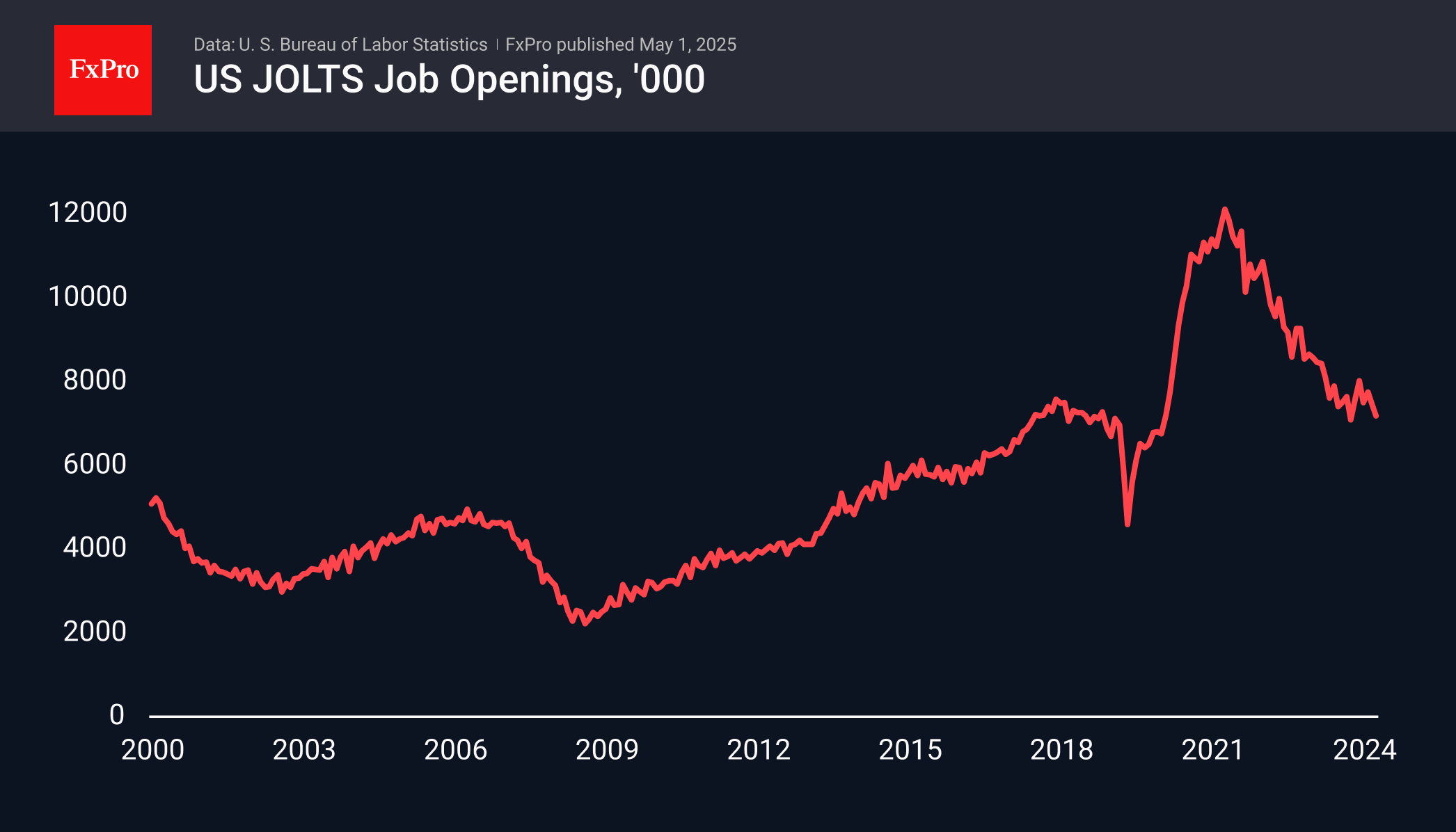 Рынок труда демонстрирует признаки слабости. Опубликованные во вторник данные отметили минимальное число новых открытых вакансий с сентября прошлого года, продолжая возвращение к норме времён до распространения удалённой работы, что вызывало взлёт числа вакансий.